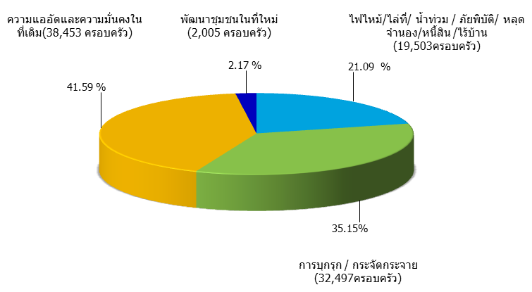 โครงการบ้านมั่นคงได้อนุมัติงบประมาณในการสนับสนุนการพัฒนากระบวนการในเมือง 73 จังหวัด 277 เมือง/เขต 191 โครงการ จำนวนเงินรวม 141.79 ล้านบาท ได้ให้การสนับสนุนพัฒนาครอบคลุม 71 จังหวัด 274 เมือง/เขต 858 โครงการ 1,546 ชุมชน 90,813 ครัวเรือน งบสนับสนุนสาธารณูปโภคจำนวนเงิน 2,887.98 ล้านบาท งบบริหารจัดการการปรับปรุงชุมชนจำนวน 116.58 ล้านบาท โดยสามารถแยกเป็นพื้นที่ภาคได้ดังนี้