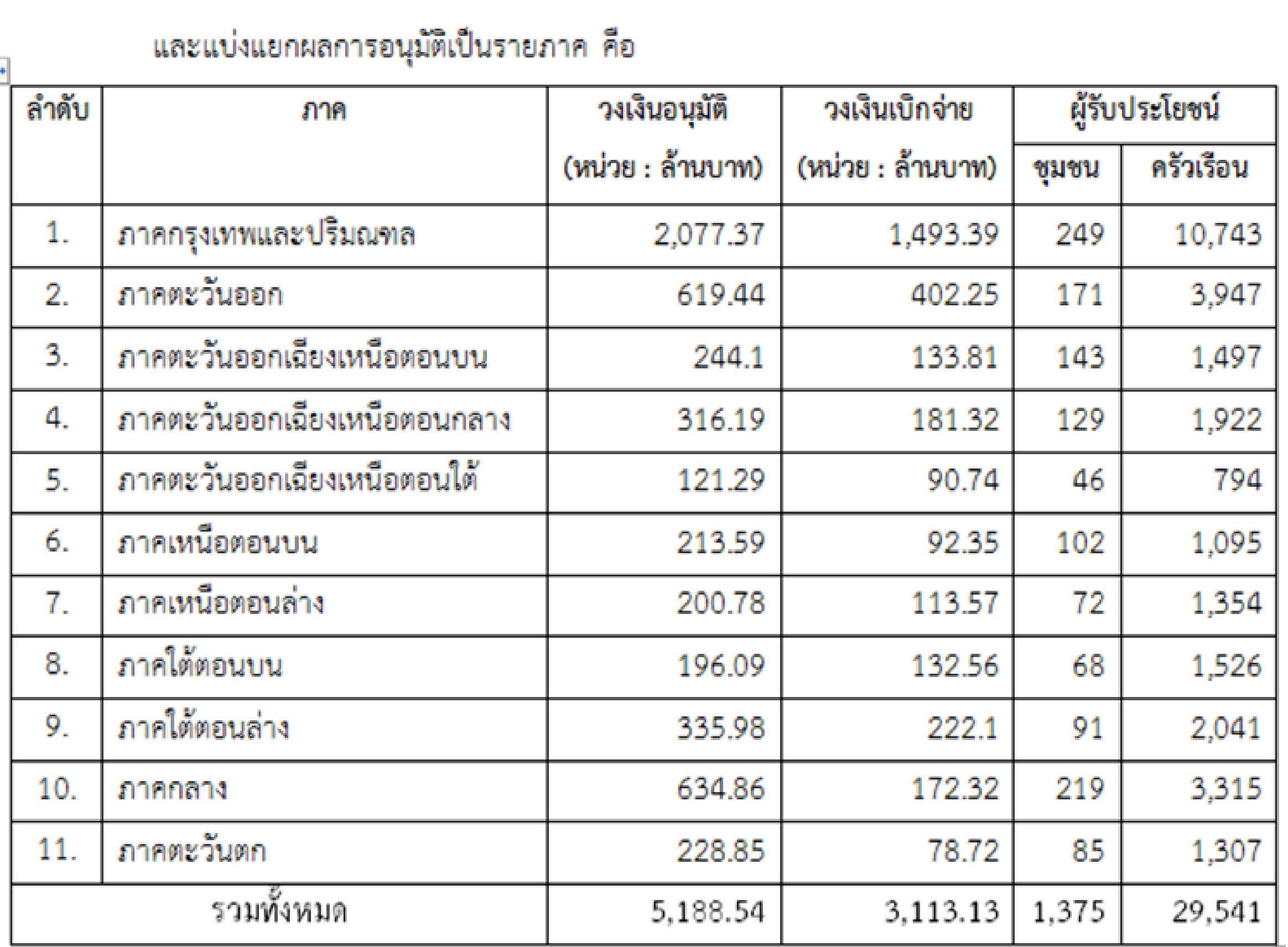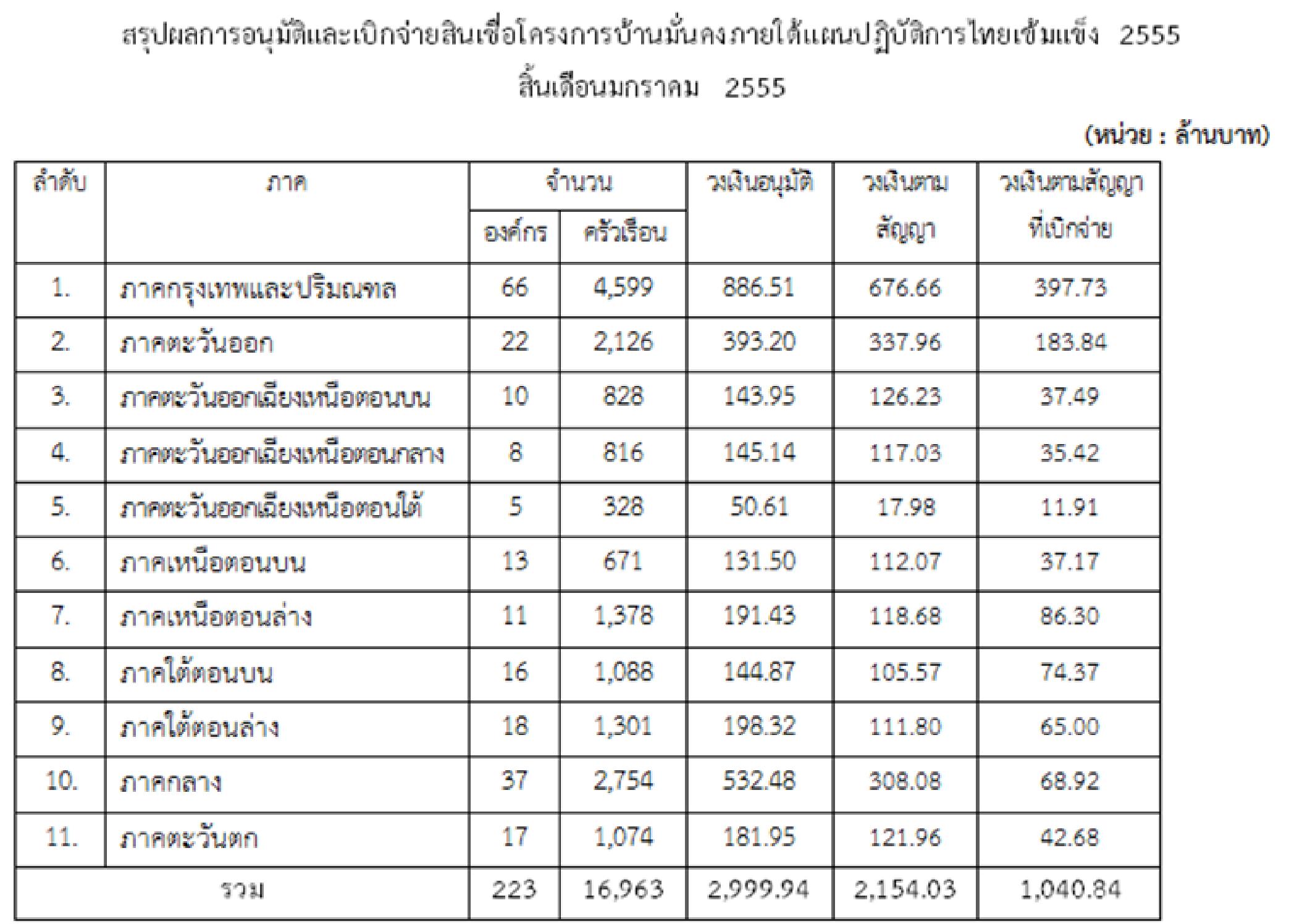 ในปีงบประมาณ 2553 (ตุลาคม 2552 – มกราคม 2555) ได้มีการอนุมัติสินเชื่อโครงการบ้านมั่นคงไทยเข้มแข็ง เป็นวงเงินรวม 2,999.94 ล้านบาท ให้แก่ 16,963 ครัวเรือนใน 223 องค์กร 58 จังหวัด โดยมีรายละเอียดแยกรายภาคดังนี้