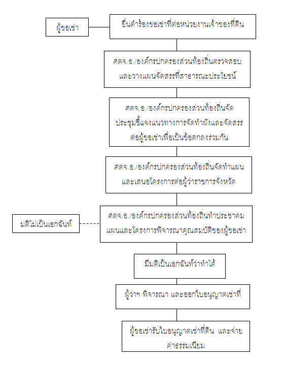 โดยผู้ขอเช่ายื่นคำร้องหรือหนังสือขอเช่าที่หน่วยงานท้องถิ่นที่เป็นเจ้าของที่ดิน และมีขั้นตอนการดำเนินการในกรณีที่บุกรุก ดังนี้