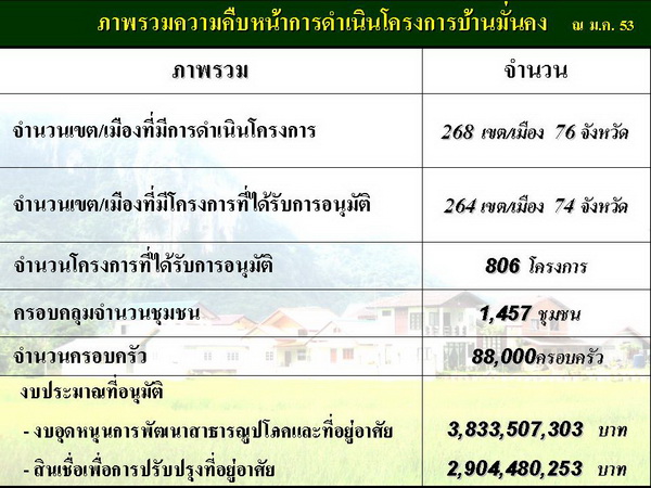 โครงการบ้านมั่นคง เป็นโครงการแก้ไขปัญหาที่อยู่อาศัยของคนจนในเมืองดำเนินการอย่างต่อเนื่องมาตั้งแต่ พ.ศ.๒๕๔๖ ปัจจุบันดำเนินการอยู่ใน ๒๖๘เมืองทั่วประเทศ จำนวน ๘๐๖ โครงการ มีชุมชนแออัดเข้าร่วม ๑,๔๕๗ ชุมชนผู้รับประโยชน์ ๘๘,๐๐๐ ครัวเรือน