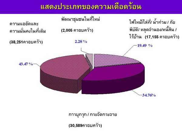 ปัญหาความไม่มั่นคงในที่อยู่อาศัยของคนยากจนในเมืองเป็นปัญหาสำคัญของประเทศ การสำรวจในปี ๒๕๕๑ พบว่ามีชุมชนแออัดทั่วประเทศ ๖,๓๐๐ชุมชน มีผู้เดือดร้อนเรื่องที่อยู่อาศัยประมาณ ๗๒๐,๐๐๐ ครัวเรือน (ประชากรไม่น้อยกว่า ๓ ล้านคน) ในระยะ ๗ ปีที่ผ่านมา รัฐบาลได้ให้การสนับสนุนงบประมาณการพัฒนาสาธารณูปโภคและที่อยู่อาศัยของชุมชนมาโดยตลอด ส่วนสินเชื่อสถาบันฯได้ใช้เงินกองทุนของสถาบันฯให้สินเชื่อเพื่อที่อยู่อาศัยแก่ชุมชนตามโครงการบ้านมั่นคงไปแล้วกว่า ๓,๐๐๐ ล้านบาท แต่ยังไม่เพียงพอกับความต้องการ จึงเสนอของบประมาณเพิ่มเติมจากรัฐบาลชุดนี้และได้รับการอนุมัติดังกล่าวมาแล้ว