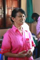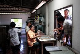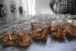 คุณหมออำพลลงมือบรรจุขนมบ้าบิ่นใส่ห่อ |