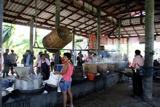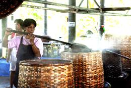 และการเคี่ยวน้ำตาลมะพร้าว เมื่อรวมน้ำตาลสดเทลงปีบเพื่อวัดปริมาณ เทน้ำตาลลงกระทะใบบัวโดยใช้กระชอน