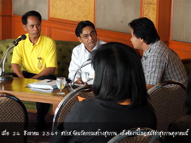 วันที่ 24 สิงหาคมที่ผ่านมา สำนักงานปฏิรูประบบสุขภาพแห่งชาติ (สปรส.) จัดประชุมเรื่องนวัตกรรมสร้างสุขภาพ ปี 2549 ณ โรงแรมปริ๊นพาเลซ กรุงเทพมหานคร เพื่อนำเสนอนวัตกรรมการสร้างสุขภาพของชุมชนรูปธรรมทั่วประเทศ ราว 60 คน
