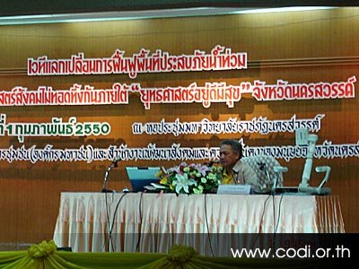 โดยมีคุณวิริยะ แต้มแก้ว ผู้ประสานงานกลุ่มจังหวัด ได้นำเสนอถึงชุดประสบการณ์การทำงานในการสนับสนุนชุมชนที่ประสบภัย รวมตัวกัน เชื่อมโยงกันเพื่อเข้าถึงชาวบ้านที่มีปัญหาในพื้นที่ แก้ปัญหาเฉพาะหน้าที่เร่งด่วนร่วมกัน และสนับสนุนการจัดทำแผนป้องกัน พัฒนาฟื้นฟูชุมชนท้องถิ่นที่ประสบภัย ทั้งในระยะเร่งด่วน ระยะปานกลางและยาว ที่สอดคล้องกับพื้นที่ ซึ่งสะท้อนให้เห็นวิธีการทำงานที่ใช้พื้นที่เป็นตัวตั้ง เปิดโอกาสให้เจ้าของปัญหา คือ ชาวบ้านเป็นหลักการแก้ไขปัญหา และร่วมมือกับทุกฝ่าย จากนั้นได้นำเสนอให้เห็นภาพรวมขบวนพัฒนาองค์กรชุมชน จ.นครสวรรค์ ซึ่งมีหลายขบวน ได้แก่ ขบวนองค์กรการเงินชุมชน บ้านมั่นคง ทรัพยากรธรรมชาติ ที่ดินทำกิน สวัสดิการ และ ขบวนฟื้นฟูชุมชนผู้ประสบภัยน้ำท่วม ซึ่งจะได้รับงบประมาณช่วยเหลือตำบลละไม่เกิน 2 แสนบาท จึงน่าจะหาแนวทางการพัฒนาโครงการให้เชื่อมโยงกัน