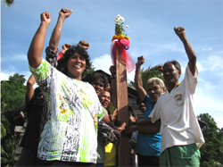 ภาพ ชาวมอแกนชุมชนเกาะเหลา ร่วมกันแสดงความยินดีในพิธียกเสามอลา หรือเสาเอกของบ้าน สมพล โชคดีศรีสวัสดิ์ รายงาน