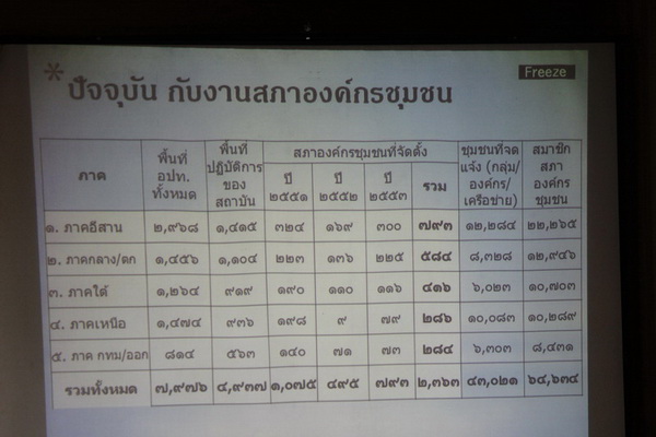 ทั้งนี้ สภาฯ จะมีอายุครบ ๓ ปี ในวันที่ ๙ กุมภาพันธ์ ๒๕๕๔ ที่จะถึงนี้ ซึ่งปัจจุบันมีสภาองค์กรชุมชนที่จดแจ้งจัดตั้งแล้วจำนวน ๒,๓๖๓ แห่ง มีกลุ่ม/เครือข่าย/องค์กรชุมชนที่ร่วมจดแจ้งรวม ๔๓,๐๒๑ กลุ่มองค์กร มีสมาชิกสภาฯ รวม ๖๔,๖๓๔ คน (ข้อมูล ณ ๑ กุมภาพันธ์ ๒๕๕๔ /ที่มา :สำนักงานที่ประชุมในระดับชาติของสภาองค์กรชุมชนตำบล)