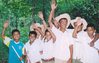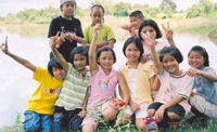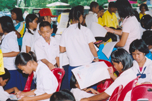 เด็กๆ เยาวชนหลายคนกำลังใจจดใจจ่อกับการวาดภาพเพื่อบอกกล่าว เรื่องป่าเขาราวเทียนทองทุกภาพล้วนแล้วแต่เป็นทิวเขาที่เต็มไปด้วยต้นไม้อย่างเขียวขจี ส่วนพื้นราบเป็นที่นา สวน ไร่และหมู่บ้านที่พวกเขาได้พักพิงอาศัยอยู่กับครอบครัวนั่นเอง”