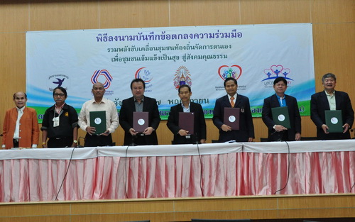 เมื่อวันที่ 17 พฤศจิกายน 2558 ขบวนองค์กรชุมชนภาคตะวันตก สถาบันพัฒนาองค์กรชุมชน (องค์การมหาชน) ศูนย์คุณธรรม (องค์การมหาชน) มหาวิทยาลัยมหามกุฏราชวิทยาลัย, สมาคมนักสร้างสุขภาวะองค์กร และมูลนิธิหัวใจอาสา ได้ร่วมลงนามบันทึกความร่วมมือ ในการขับเคลื่อนงานด้านการส่งเสริมชุมชนท้องถิ่นจัดการตนเอง เพื่อชุมชนเข้มแข็งเป็นสุข สู่สังคมคุณธรรม และมีเจตนารมณ์ในการดำเนินงานตามบันทึกข้อตกลงความร่วมมือ โดยมีผู้เข้าร่วมประมาณ 5 0 คน และผู้อำนวยการ สถาบันพัฒนาองค์กรชุมชน นายพลากร วงค์กองแก้ว ได้กล่าวเปิดงาน แสดงความยินดีที่มีการลงนามบันทึกความร่วมมือครั้งนี้และเชื่อมั่นในศักยภาพของขบวนองค์กรชุมชนภาคตะวันตกว่าจะสามารถสร้างความเข้มแข็งให้กับชุมชนท้องถิ่น ซึ่งจะเป็นทั้งชุมชนที่มีความสุขและมีคุณธรรม