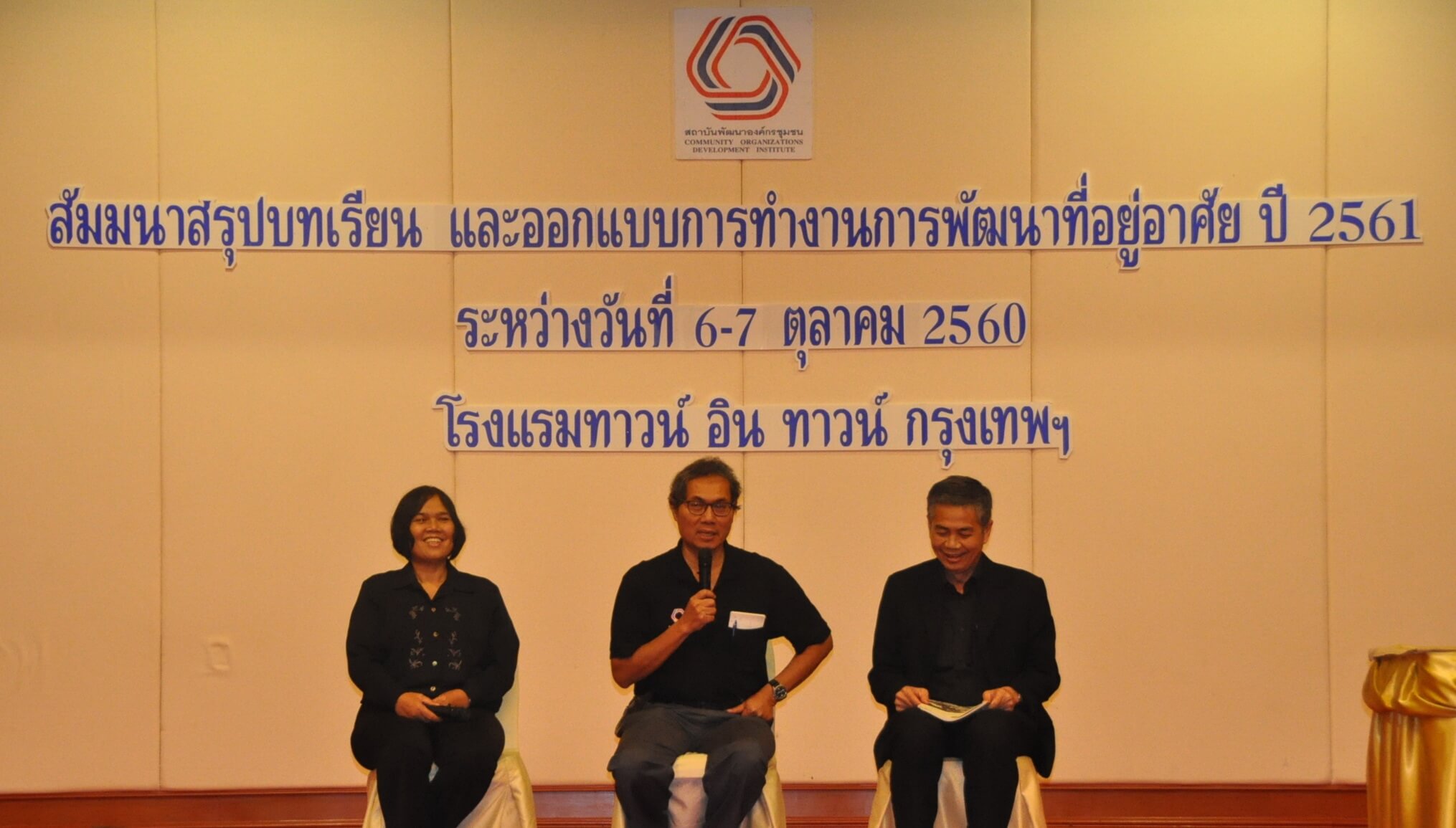 กรุงเทพฯ/ ปิดสัมมนาสรุปบทเรียนและออกแบบที่อยู่อาศัยปี 2561 ผู้แทนองค์กรชุมชนทั้ง 5 ภาคได้ข้อสรุปร่วมกัน เน้นการพัฒนาทั้งเมือง และพัฒนาทุกมิติ ไม่ใช่แค่สร้างบ้าน เชื่อมโยงและประสานหน่วยงาน ภาคี มาทำงานร่วมกัน และเตรียมผลักดันแผนสู่ระดับนโยบาย เป้าหมายเพื่อสังคมมีสุขทุกถ้วนหน้า เผยครัวเรือนเป้าหมายที่จะพัฒนาในปีหน้าทะลุเพดานทุกภาค เช่น บ้านมั่นคงเมืองและชนบททั่วประเทศไม่เกิน 6,710 ครัวเรือน ผู้แทนฯ 5 ภาคเสนอแผนงานรวม 13,031 ครัวฯ บ้านพอเพียงชนบทไม่เกิน 15,000 ครัวฯ เสนอแผนงานรวม 27,258 ครัวฯ