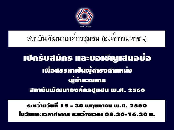 คณะอนุกรรมการสรรหาผู้อำนวยการสถาบันพัฒนาองค์กรชุมชน ขอเรียนเชิญผู้ที่สนใจสมัคร หรือบุคคล เครือข่ายองค์กรชุมชน องค์กร หรือหน่วยงานที่เกี่ยวข้อง เสนอชื่อบุคคลเพื่อสรรหาเป็นผู้ดำรงตำแหน่งผู้อำนวยการสถาบันพัฒนาองค์กรชุมชน พ.ศ. 2560 ทั้งนี้เปิดรับสมัครและเสนอชื่อ ระหว่างวันที่ 15 - 30 พฤษภาคม พ.ศ. 2560 ในวันและเวลาทำการ ระหว่างเวลา 08.30 - 16.30 น. สอบถามรายละเอียดได้ที่ 0-2378-8300 ต่อ 8207 , 8231 ...